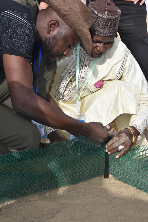 這位卡諾州環境部生態和林業主管按照中國專家的講授和示范,把條狀的可降解乳酸纖維沙袋灌滿沙子,擺成方格形狀,又拿起沉甸甸的鐵錘,把小樁子敲進沙地里,圍上高密度固沙網。
