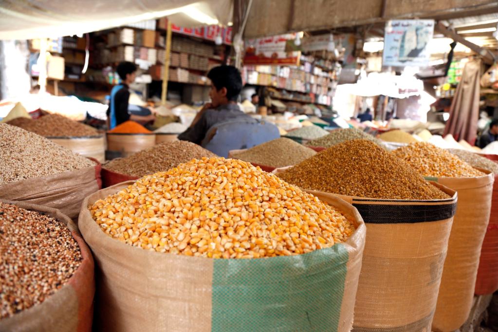 這是2022年6月29日在也門薩那拍攝的出售糧食的攤位。新華社發(穆罕默德·穆罕默德攝)