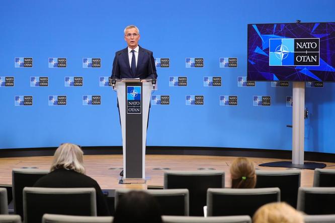 2022年6月16日,在比利時布魯塞爾的北約總部,北約秘書長斯托爾滕貝格在北約成員國國防部長會議后的新聞發布會上發言。新華社記者鄭煥松攝
