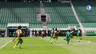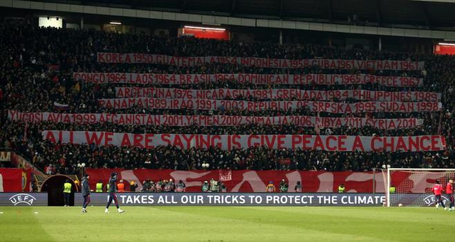 2022年3月17日,在塞爾維亞首都貝爾格萊德舉行的一場足球比賽中,塞爾維亞觀眾拉起多條橫幅,并高唱反戰歌曲,以此諷刺西方在“反戰”方面的雙重標準。新華社發(普雷德拉格·米洛薩夫列維奇攝)
