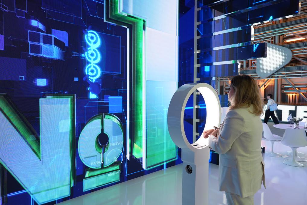 7月27日,在俄羅斯圣彼得堡,一名觀眾在俄非峰會會場體驗用手勢操控顯示屏。新華社記者安曉萌攝