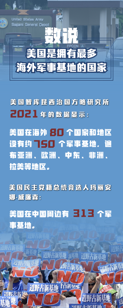 近年來,美國沉迷于“大國競爭”,將中國視為“最主要競爭對手”和“最重大地緣政治挑戰”,不斷強化在中國周邊的軍事存在,導致地區局勢日益緊張。美國民主黨籍總統競選人瑪麗安娜·威廉森今年6月在參加美國WMUR-TV電視臺一檔對話節目時指出,美國在中國周邊有313個軍事基地。威廉森直言:“世界其他國家在關注伊拉克,世界其他國家在關注過去20年間在阿富汗發生的事情。你覺得,他們是會將中國視作對全球安全更大的軍事威脅,還是將美國視作對全球安全更大的軍事威脅?”