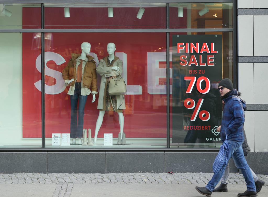 3月2日,在德國柏林,行人經過一家打折店鋪。(新華社發,斯特凡·蔡茨攝)