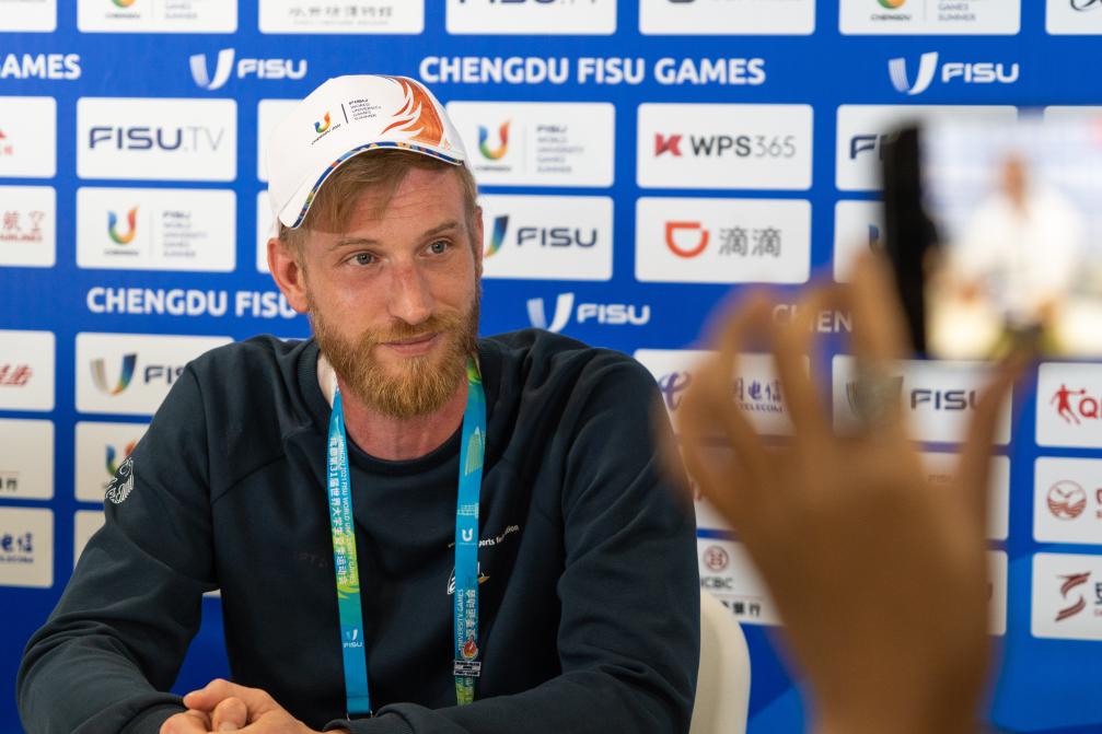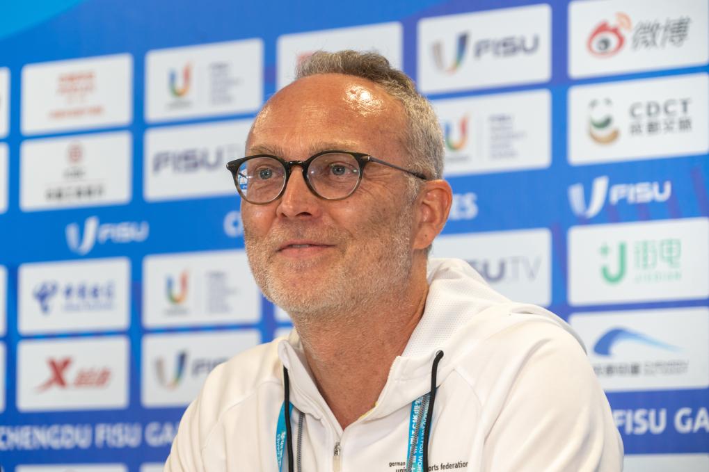 這是8月6日拍攝的萊茵-魯爾2025世界大學生夏季運動會首席新聞宣傳官馬庫斯·柯尼希在接受媒體采訪。 新華社記者 龍泠宇 攝