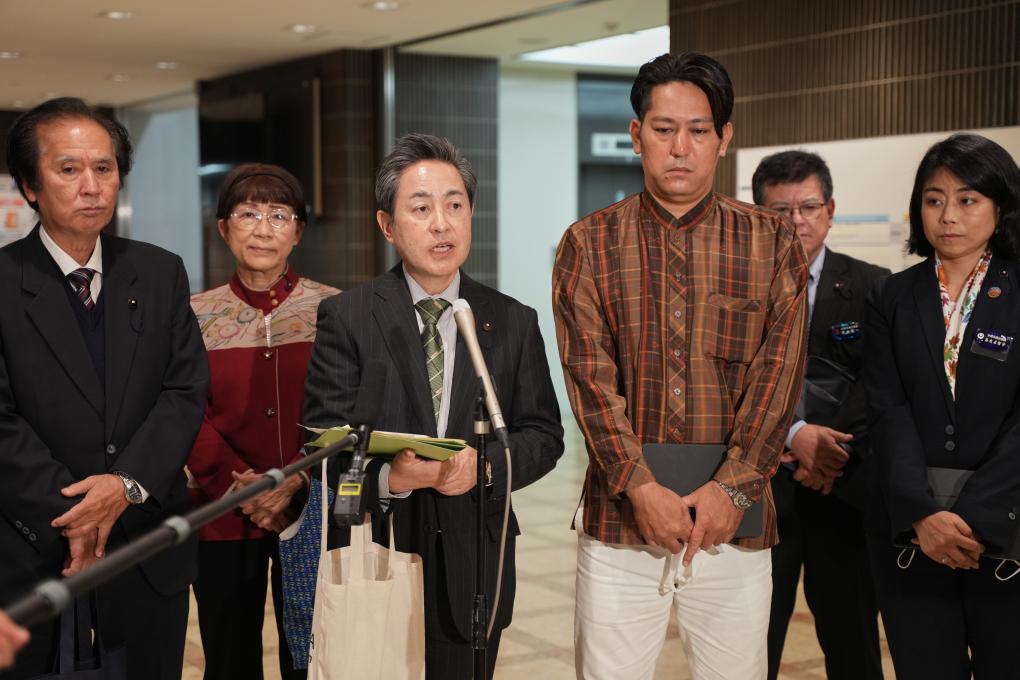 4月25日,在日本東京外務省,沖繩縣議員當山勝利(左三)接受記者采訪。日本沖繩縣議員代表團分別于4月24日和25日在首都東京向日本防衛省、日本內閣府和日本外務省遞交了該縣議會通過的和平外交意見決議書,呼吁日本政府不要讓沖繩淪為戰場,而應通過對話和外交方式和平解決問題。新華社記者張笑宇攝