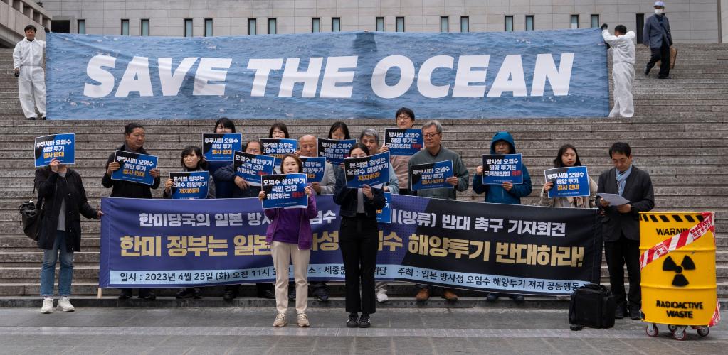 4月25日,在韓國首爾,民眾手舉標語抗議日本政府核污染水排海計劃。新華社發(李相浩攝)