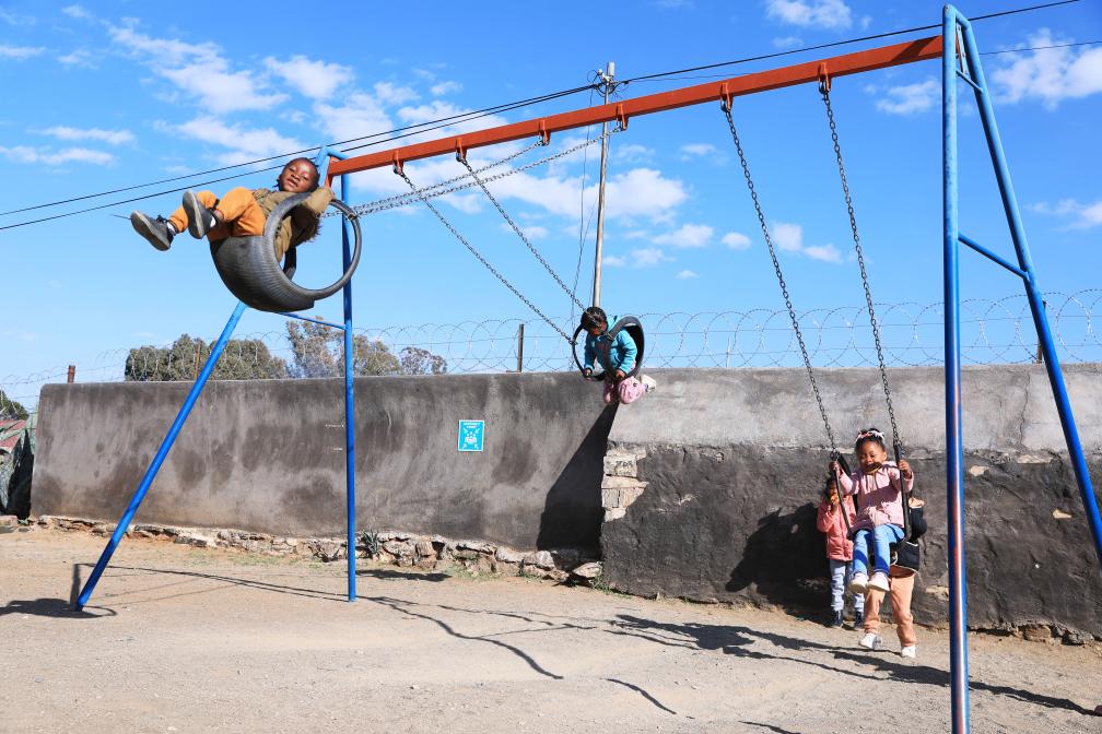 8月11日,孩子們在南非德阿鎮的一家兒童早教中心蕩秋千。這家早教中心由中國龍源南非公司出資成立運營。(新華社記者董江輝攝)