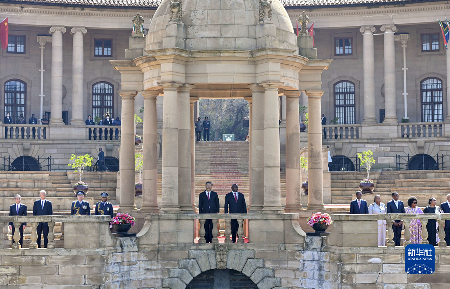 8月的比勒陀利亞,晴空萬里,惠風和暢??偨y府廣場鮮花盛開,中南兩國國旗迎風飄揚。在總統摩托車隊護衛下,習近平乘車抵達總統府,拉馬福薩在下車處熱情迎接。兩國元首登上檢閱臺。儀仗隊行持槍禮,軍樂隊奏中南兩國國歌,現場鳴放21響禮炮。習近平檢閱南非儀仗隊。兩國元首同雙方陪同人員一一握手。