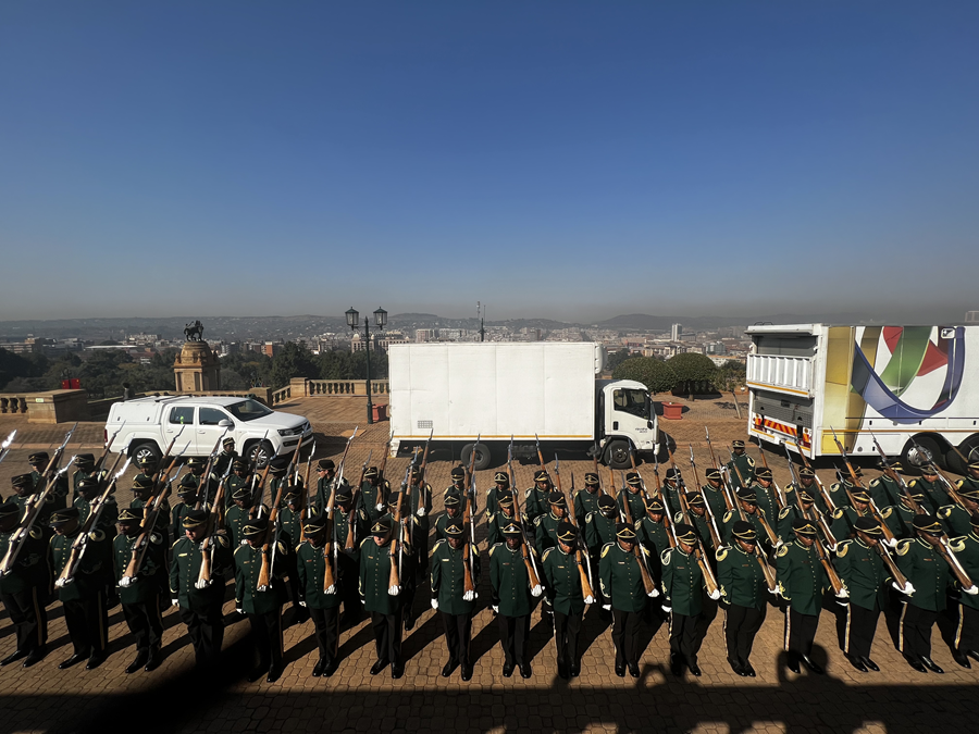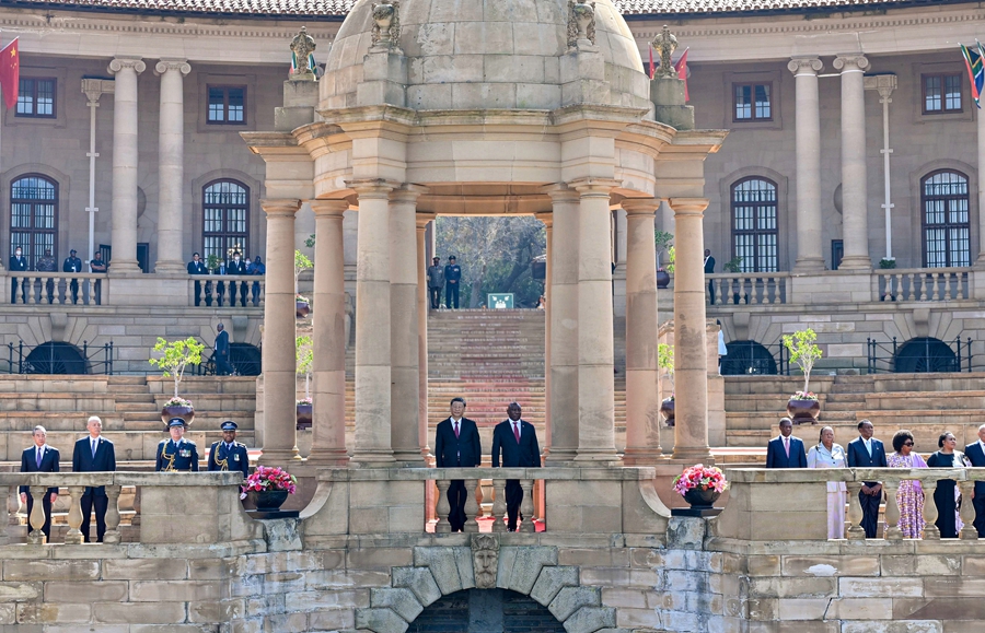 在總統摩托車隊護衛下,習近平主席乘車抵達總統府,拉馬福薩總統在下車處熱情迎接。兩國元首登上檢閱臺。儀仗隊行持槍禮,軍樂隊奏中南兩國國歌,現場鳴放21響禮炮。習近平主席檢閱南非儀仗隊。