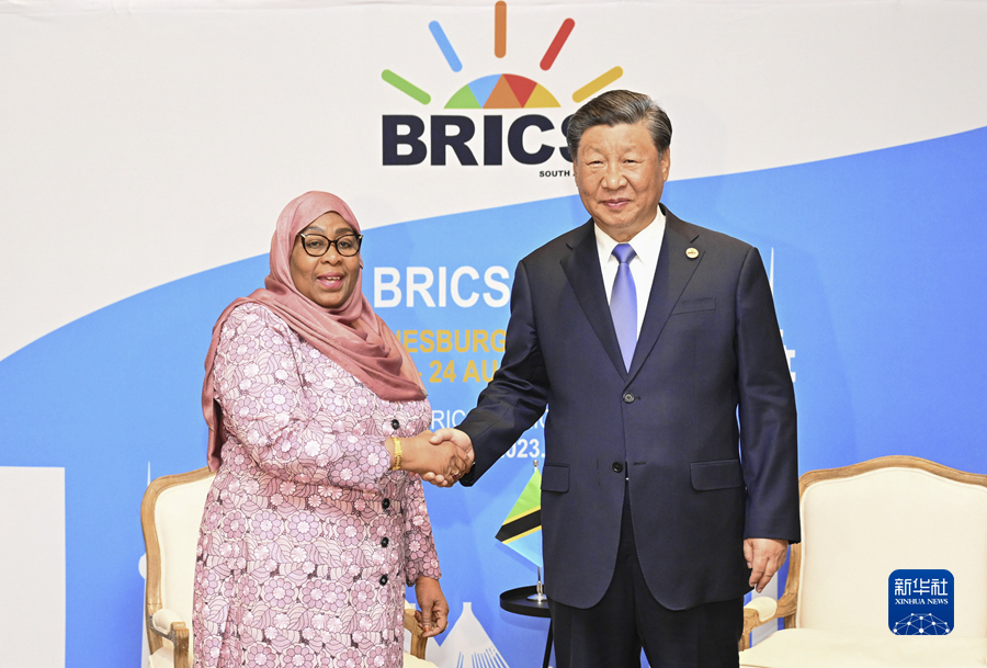 當地時間8月24日上午,國家主席習近平在約翰內斯堡出席金磚國家領導人會晤期間會見坦桑尼亞總統哈桑。
