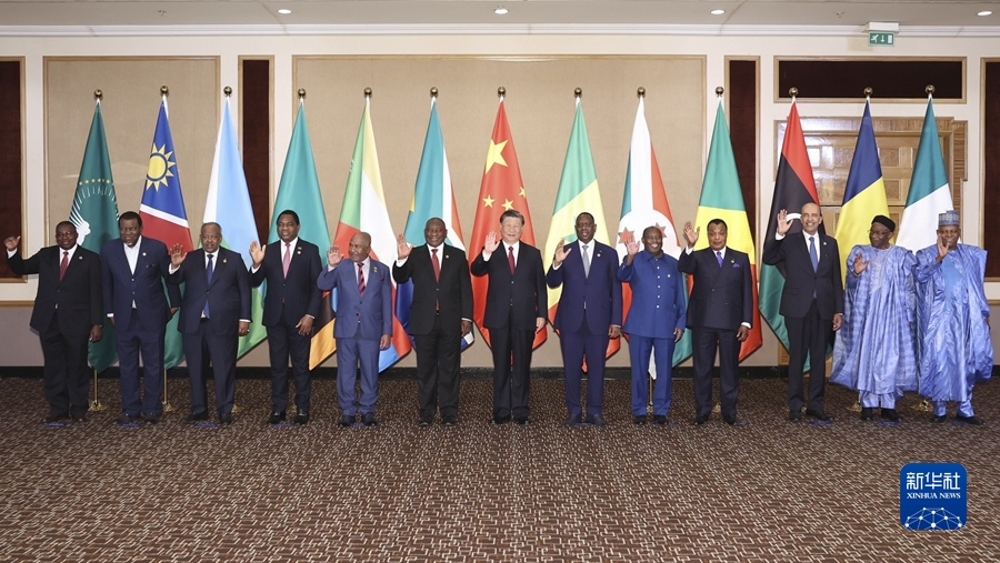 非盟輪值主席、科摩羅總統阿扎利,中非合作論壇非方共同主席國、塞內加爾總統薩勒,非洲次區域組織代表贊比亞總統希奇萊馬、布隆迪總統恩達伊施米耶、吉布提總統蓋萊、剛果(布)總統薩蘇、納米比亞總統根哥布、乍得總理凱布扎博、利比亞總統委員會副主席庫尼、尼日利亞副總統謝蒂馬,以及非盟委員會代表穆昌加等出席。這是會前集體合影。新華社記者 黃敬文 攝