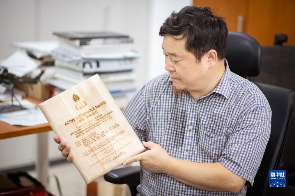 9月12日,在武漢中南建筑設計院總部,唐文勝展示中部非洲文化藝術中心設計方案獲獎獎牌。新華社記者 伍志尊 攝