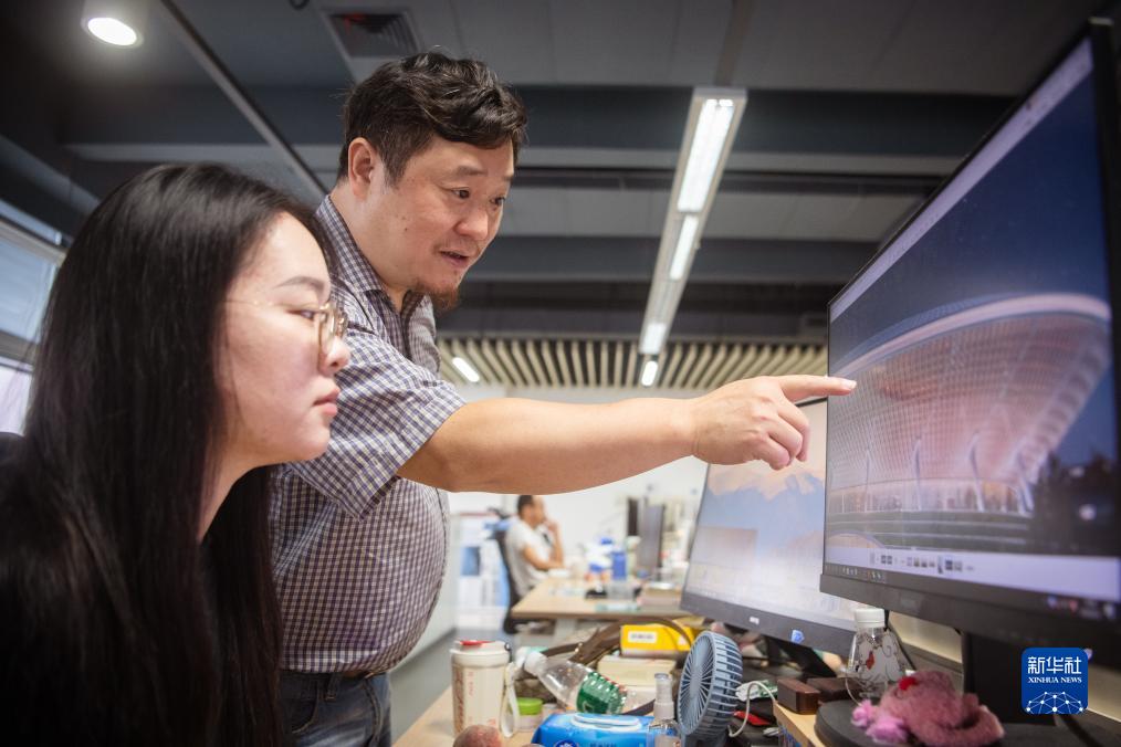 9月12日,在武漢中南建筑設計院總部,唐文勝(右)與同事交流中部非洲文化藝術中心設計方案。新華社記者 伍志尊 攝