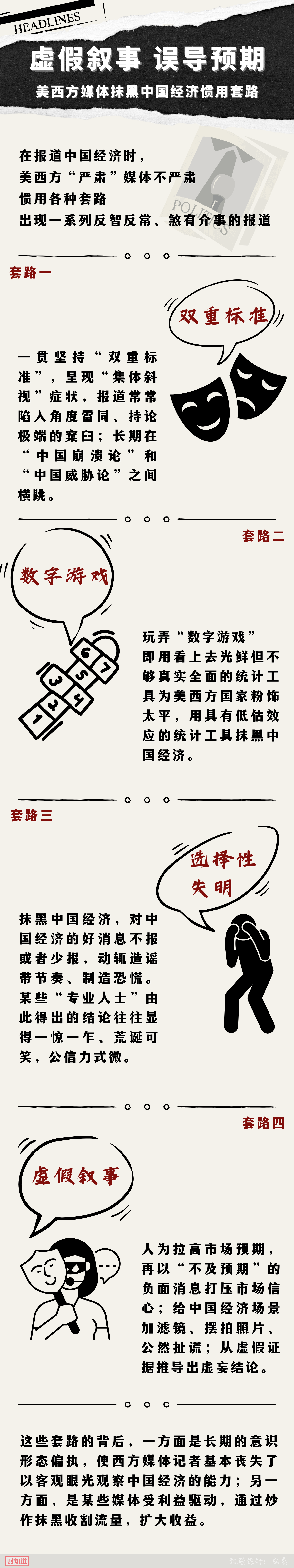 這些套路的背后,一方面是長期的意識形態偏執,使西方媒體記者基本喪失了以客觀眼光觀察中國經濟的能力;另一方面,是某些媒體受利益驅動,通過炒作抹黑收割流量,擴大收益。