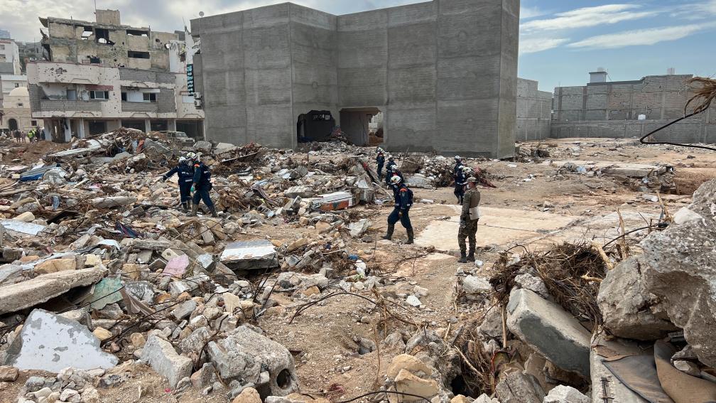 9月17日,國際救援人員在利比亞德爾納的建筑廢墟上工作。新華社發(哈姆扎·圖爾基亞攝)