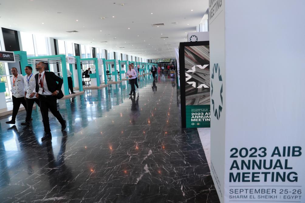 9月26日,在埃及沙姆沙伊赫,參會者走過亞投行第八屆理事會年會的展板。新華社記者隋先凱攝