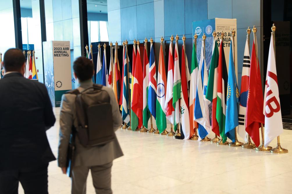 9月26日,在埃及沙姆沙伊赫舉行的亞投行第八屆理事會年會期間,參會者走過亞投行成員國國旗。新華社記者隋先凱攝