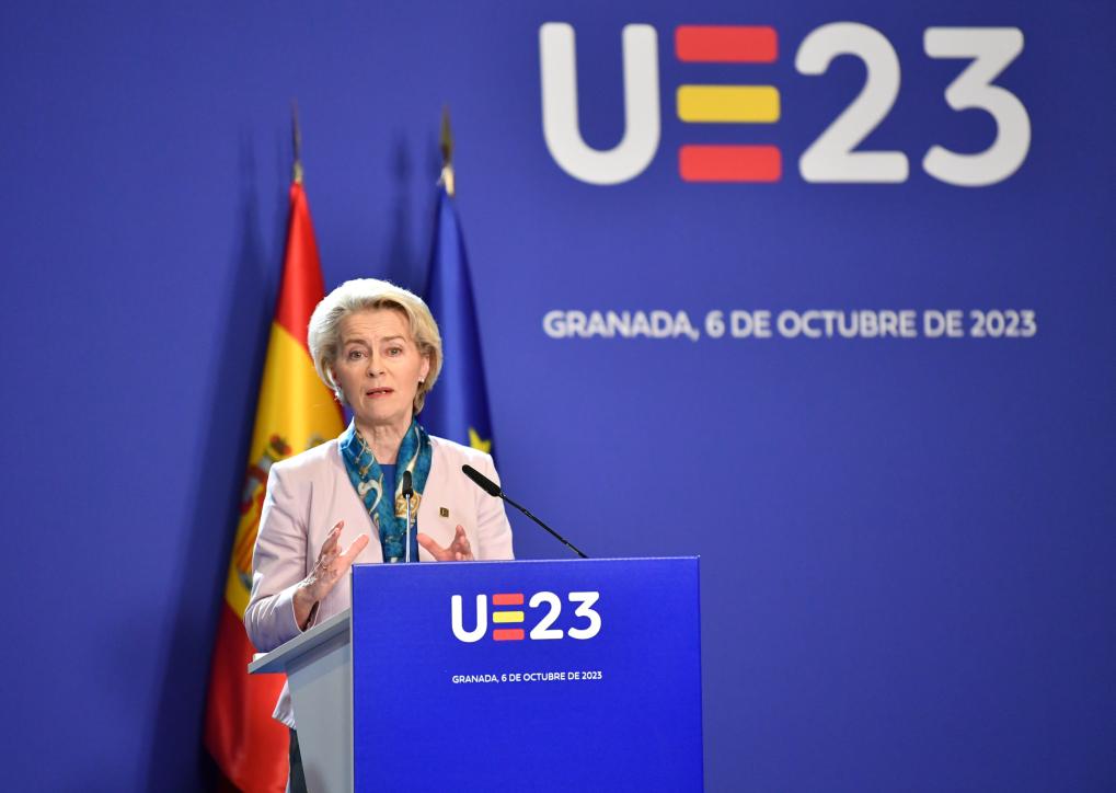 10月6日,在西班牙南部城市格拉納達,歐盟委員會主席馮德萊恩在歐盟領導人非正式會議后舉行的新聞發布會上講話。新華社記者連漪攝