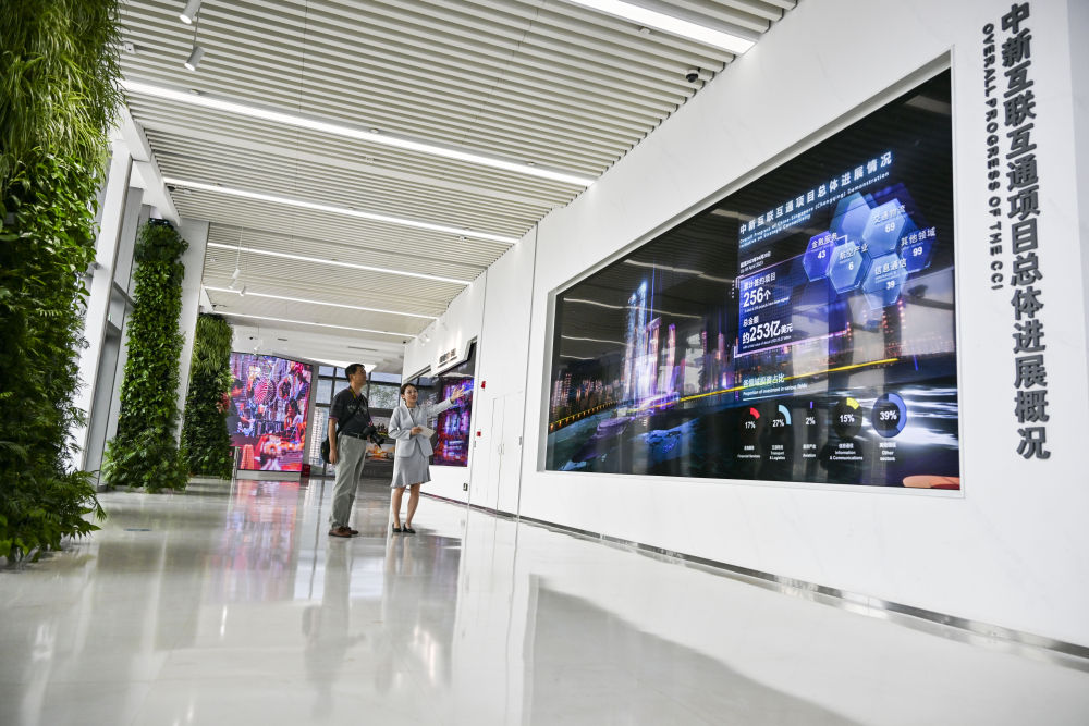 ↑人們在位于重慶來福士的中新互聯互通項目展廳內參觀。