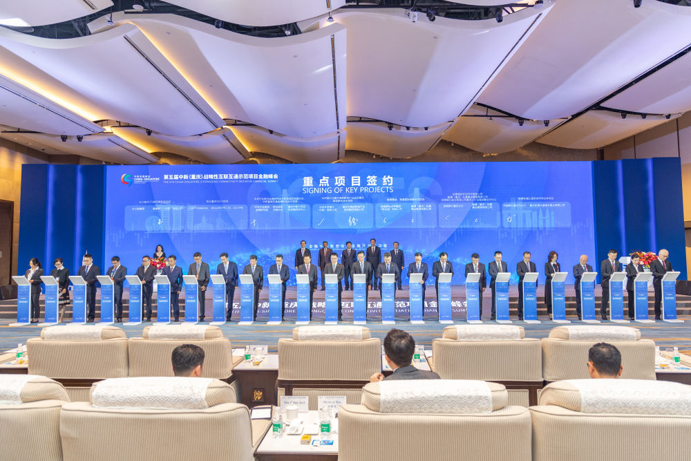 ↑2023年4月20日,重慶市第五屆中新(重慶)戰略性互聯互通示范項目金融峰會開幕式現場舉行重點項目簽約儀式。