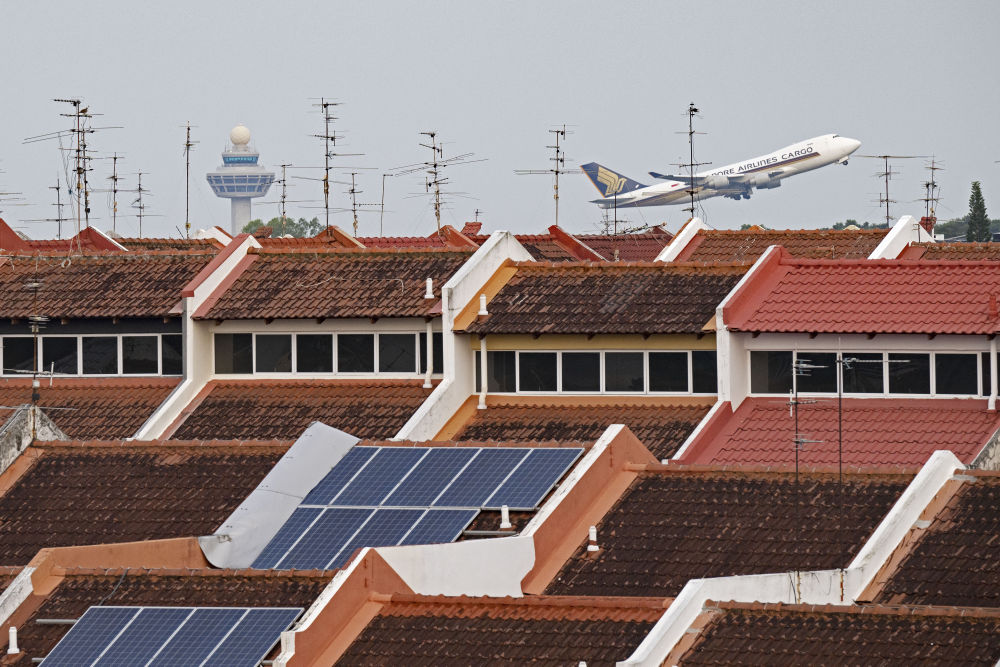 ↑一架新加坡航空公司運輸機從新加坡樟宜機場起飛。新加坡樟宜機場是大型國際樞紐機場,年客容量可達8500萬,年貨郵吞吐量可超過200萬噸。