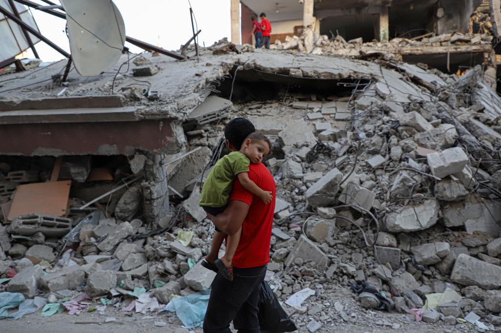 10月16日,在加沙地帶南部城市汗尤尼斯,人們從遭以色列空襲損毀的建筑廢墟前走過。新華社發(里澤克·阿卜杜勒賈瓦德攝)