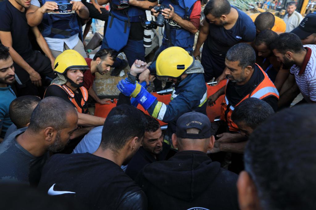 10月16日,在加沙地帶南部城市汗尤尼斯,人們在遭以色列襲擊后的建筑廢墟中救援傷者。新華社發(亞西爾·庫迪攝)