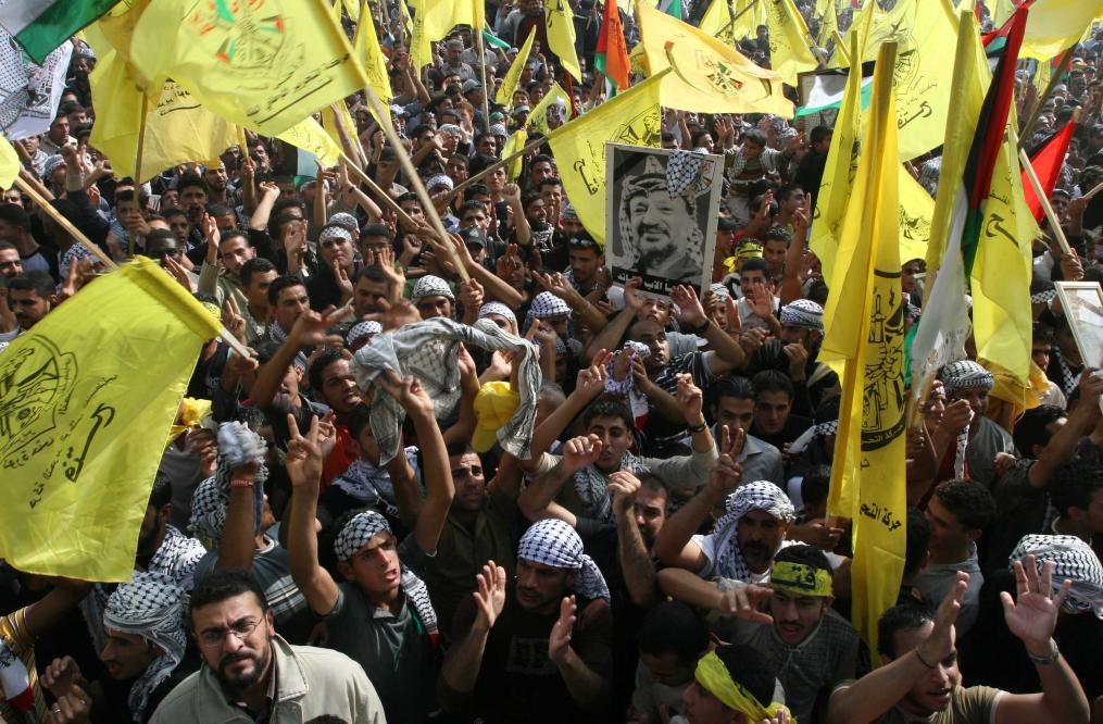 2007年11月12日,法塔赫的支持者手持法塔赫的旗幟參加在加沙舉行的紀念阿拉法特逝世3周年集會。集會上法塔赫與哈馬斯的支持者爆發沖突。新華社記者納賽爾攝