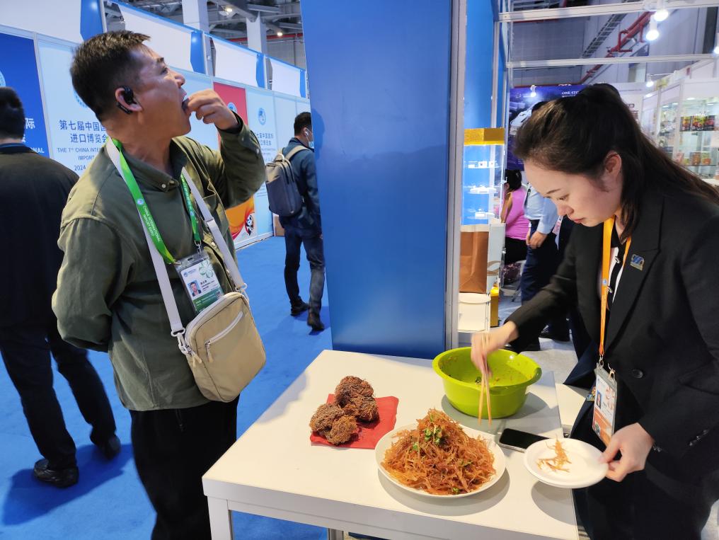 11月7日,第六屆進博會東非商貿物流中心展臺前,觀眾品嘗麒麟菜。新華社記者 楊洋攝