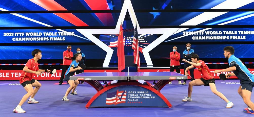 這是中美混雙組合在2021年11月下旬舉行的休斯敦世界乒乓球錦標賽期間合練。中美選手在休斯敦世乒賽上聯合組隊出戰混合雙打比賽,紀念中美“乒乓外交”50周年。新華社記者 吳曉凌 攝