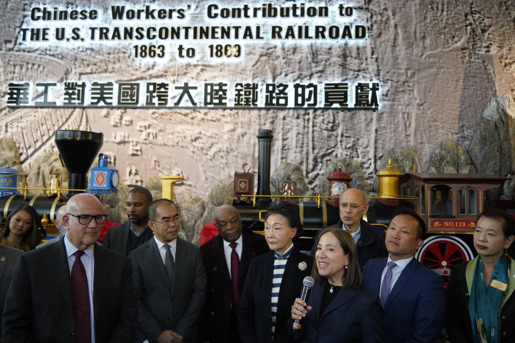 2023年5月10日,美國加利福尼亞州副州長埃萊妮·庫納拉基斯(右三)在舊金山舉行的“鐵路華工歷史中心”揭幕儀式上講話。新華社記者 吳曉凌 攝