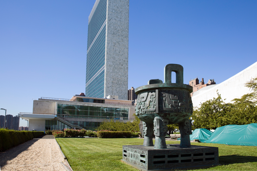 這是2015年9月15日在美國紐約聯合國總部拍攝的“世紀寶鼎”?!笆兰o寶鼎”是中國在1995年聯合國成立50周年之際,贈送給聯合國的禮物。新華社記者 李木子 攝