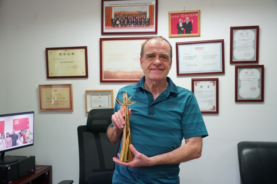 大衛·弗格森在辦公室向記者展示他所獲得的蘭花獎獎杯。新華社記者 朱昊晨 攝