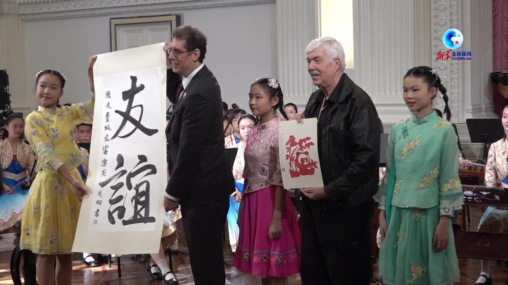 兩名少年兒童把在現場完成的寫有“友誼”二字的書法作品和以熊貓為主題的剪紙作品,作為禮品贈送給費城交響樂團。
