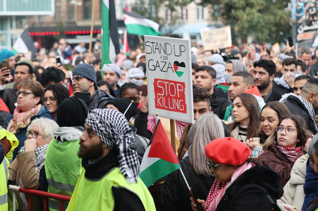 11月11日,眾多巴勒斯坦支持者在比利時布魯塞爾集會,呼吁盡快實現加沙?;?。新華社記者 趙丁喆 攝