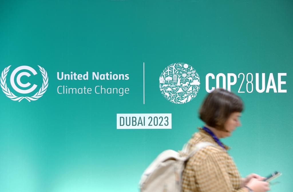 圖為2023年12月1日,在阿聯酋迪拜的聯合國氣候變化大會舉辦場地,一名參會者路過大會標識。(新華社記者王東震攝)