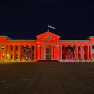 2022年1月31日,尼加拉瓜首都馬那瓜市中心標志性建筑國家宮點亮“中國紅”。新華社發(中國駐尼加拉瓜使館供圖)
