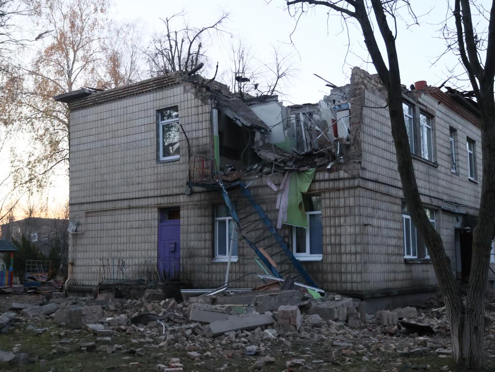 烏克蘭空軍11月25日在社交媒體發文說,俄羅斯當天凌晨出動75架攻擊型無人機對烏發動空襲,空襲主要方向是烏首都基輔市。圖為基輔市一棟建筑屋頂被無人機碎片擊中。新華社發(羅曼·佩圖什科夫攝)