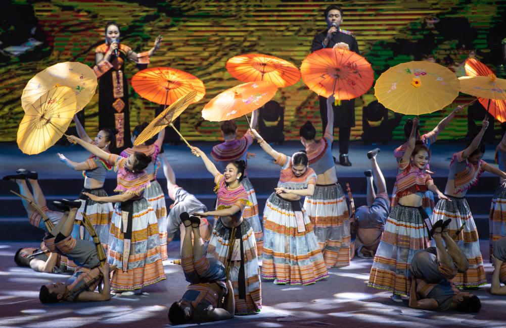 2023年1月18日,以“同心筑厚誼 攜手共發展”為主題的2023年中越跨國春節聯歡晚會在云南省紅河哈尼族彝族自治州河口瑤族自治縣舉行,越南老街省民族藝術歌舞團的演員在晚會上表演歌舞《漂浮在云端的節日》。 新華社記者胡超 攝