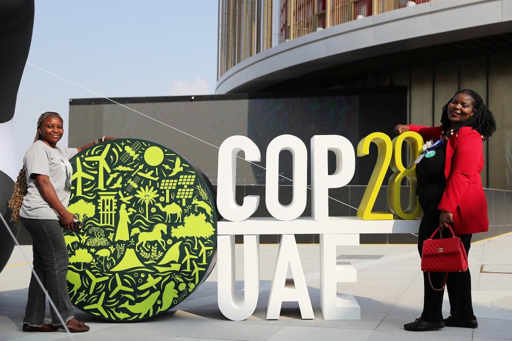 2023年12月3日,人們在聯合國氣候變化迪拜大會“綠區”的大會標識旁合影。新華社記者王東震攝
