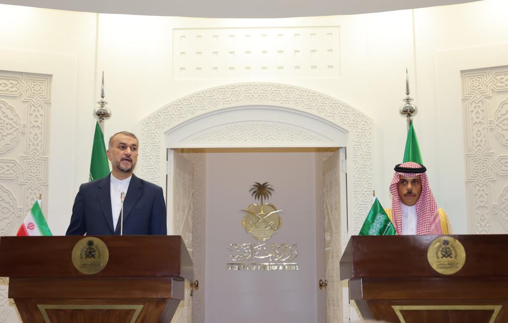 2023年8月17日,沙特阿拉伯外交大臣費薩爾(右)、伊朗外長阿卜杜拉希揚在沙特阿拉伯利雅得出席新聞發布會。新華社記者王海洲攝