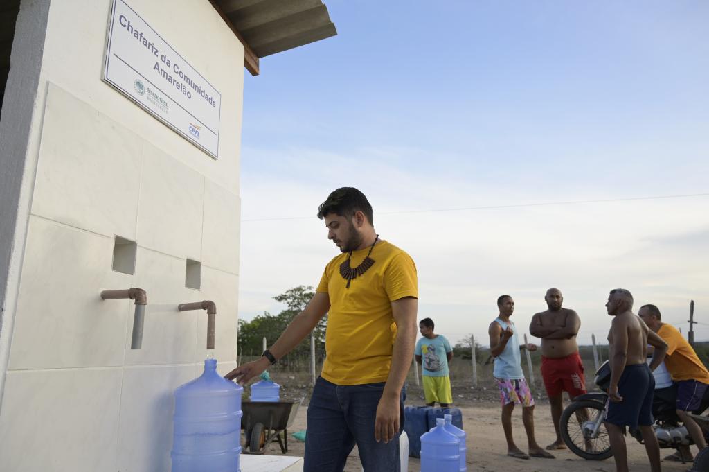 2023年2月14日,在巴西北里奧格蘭德州若昂卡馬拉市,當地居民在中國國家電網公司巴西苦咸水淡化公益項目社區取水點取水。新華社記者陳昊佺攝