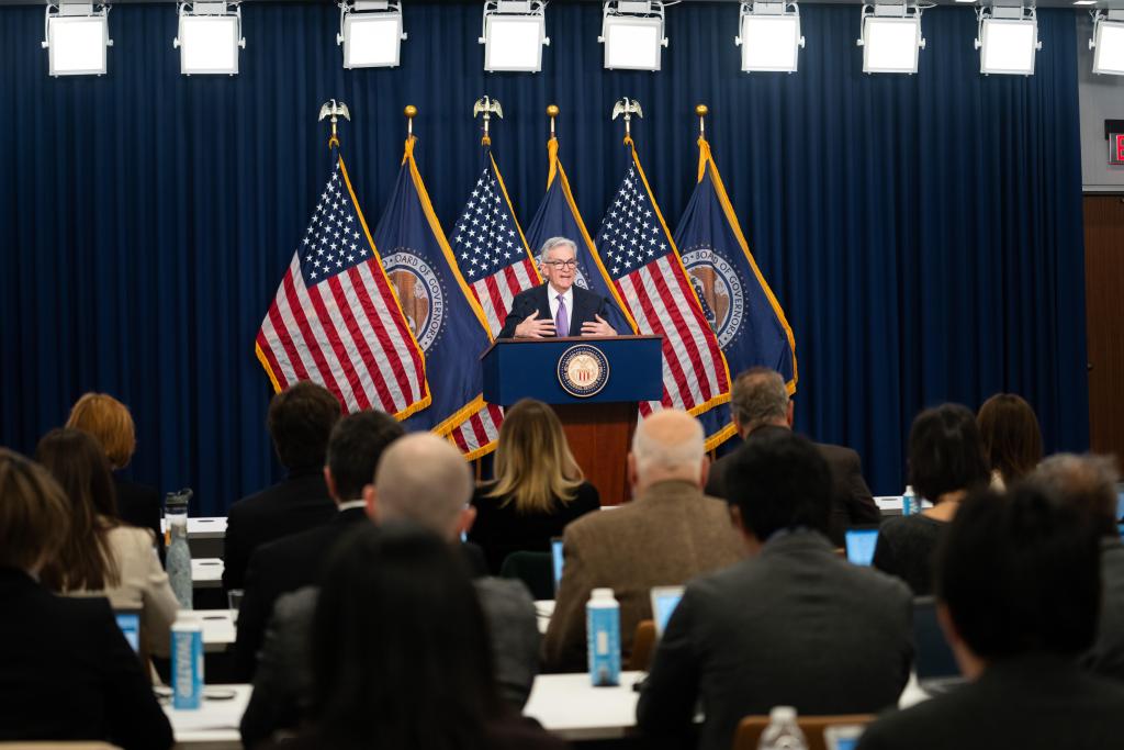 2023年12月13日,美國聯邦儲備委員會主席鮑威爾(后)在華盛頓出席記者會。新華社記者劉杰攝