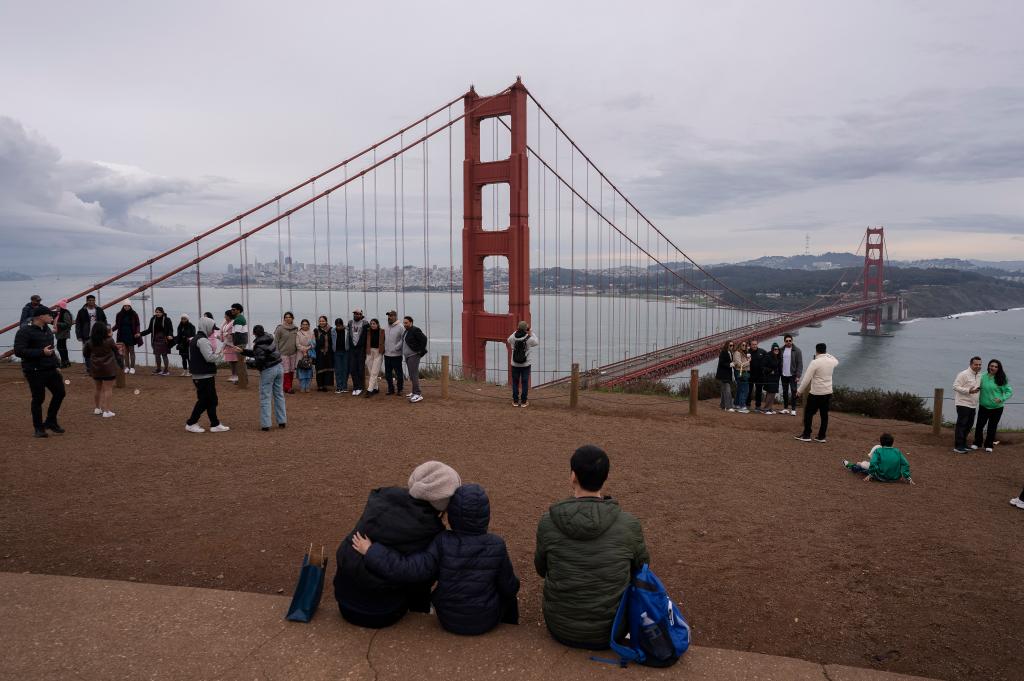 2023年12月31日,在美國舊金山金門大橋附近,人們欣賞2023年最后一縷夕陽映照下的景色。新華社發(李建國攝)