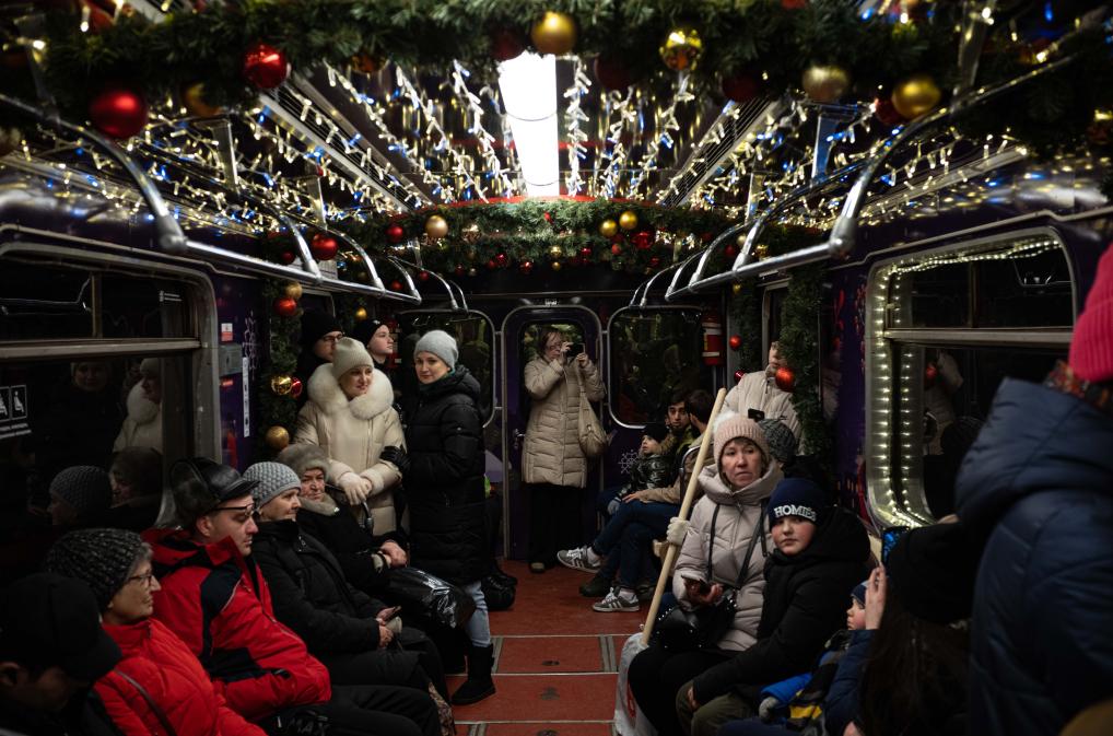 1月1日,人們在俄羅斯首都莫斯科乘坐地鐵新年專列。(新華社記者白雪騏攝)