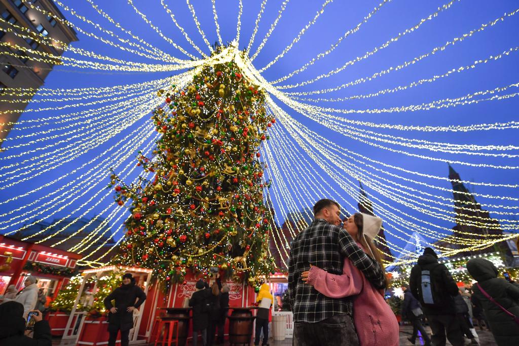 2023年12月21日,在俄羅斯首都莫斯科,人們在新年樅樹下擁抱。新華社發(亞歷山大攝)