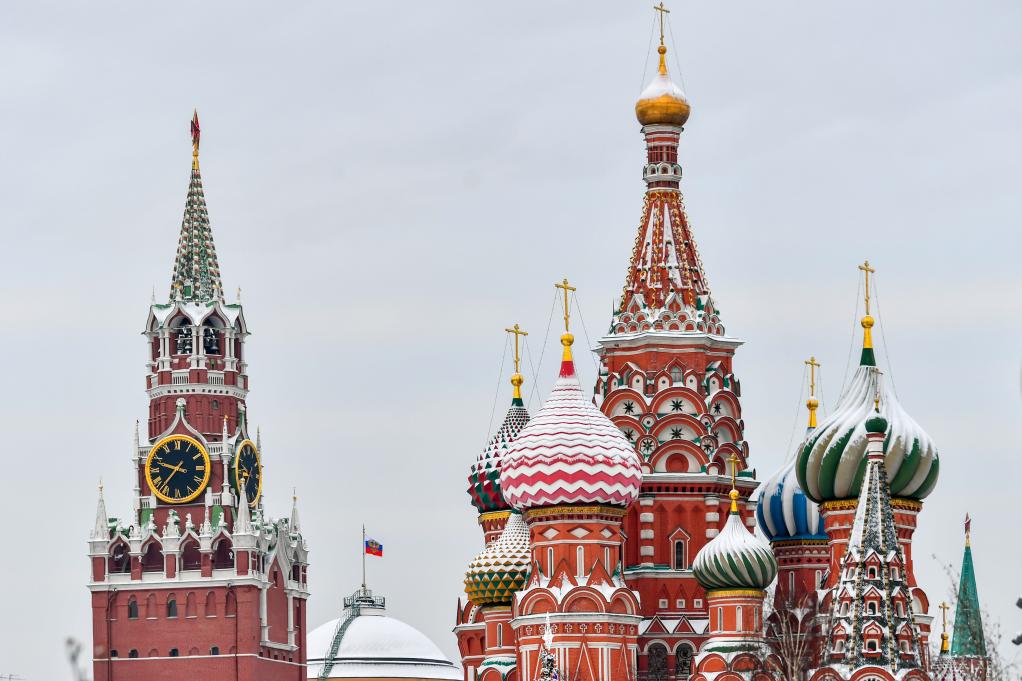 這是1月6日在俄羅斯首都莫斯科拍攝的雪后克里姆林宮(左)和圣瓦西里教堂。(新華社記者曹陽攝)