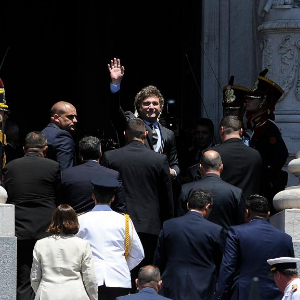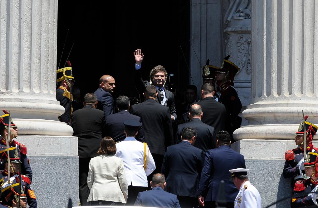 2023年12月10日,在阿根廷布宜諾斯艾利斯的國會廣場,阿根廷新總統米萊在就職儀式前向民眾致意。新華社發(哈維爾·岡薩雷斯攝)