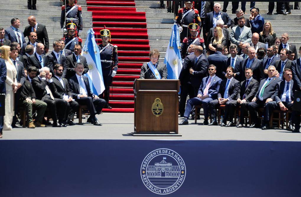 2023年12月10日,在阿根廷布宜諾斯艾利斯的國會廣場,阿根廷新總統米萊(中)在就職儀式后發表演講。新華社發(哈維爾·岡薩雷斯攝)