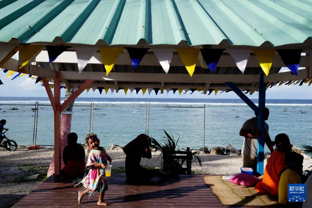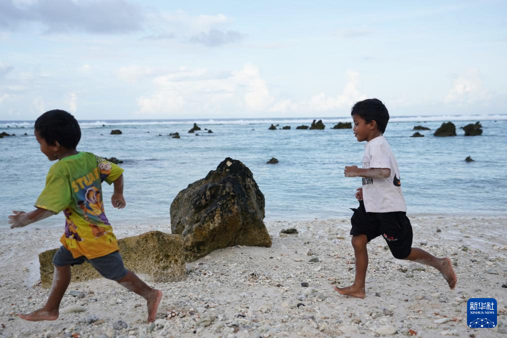1月20日,兒童在瑙魯海邊嬉戲。新華社記者 王申 攝
